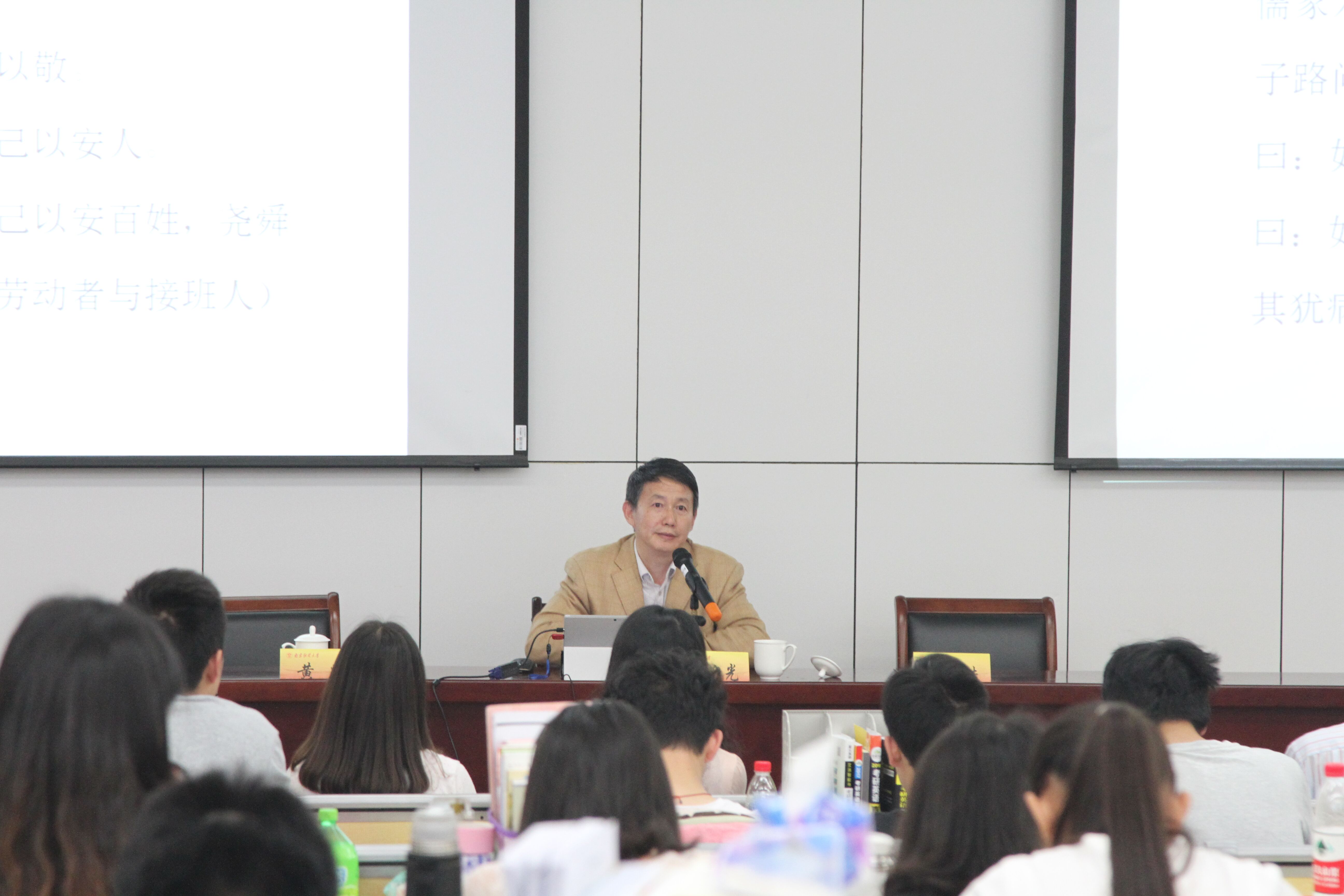 孙迎光教授对儒学和中国传统道德文化有着多年的研究和独到的见解,特别推崇优秀道德文化的传承。他向大家介绍了儒家文化的历史演变和中国传统文学的经典之处,结合经典名句和历史故事向大家详细讲解了增知法、尚志法、榜样法、改过法、内省法、忠恕法、躬行法、积善法、慎独法和自强法等十种儒家修身方法。孙教授联系大学生们的生活,启迪同学们在学习学术知识的同时,多去理解感悟儒家文化,不断提高自身的文学素养和道德修养。孙教授对各种经典名句信手拈来,用极富感染力的语言,为大家展示了深层次的儒家文化与人生修养的内涵。