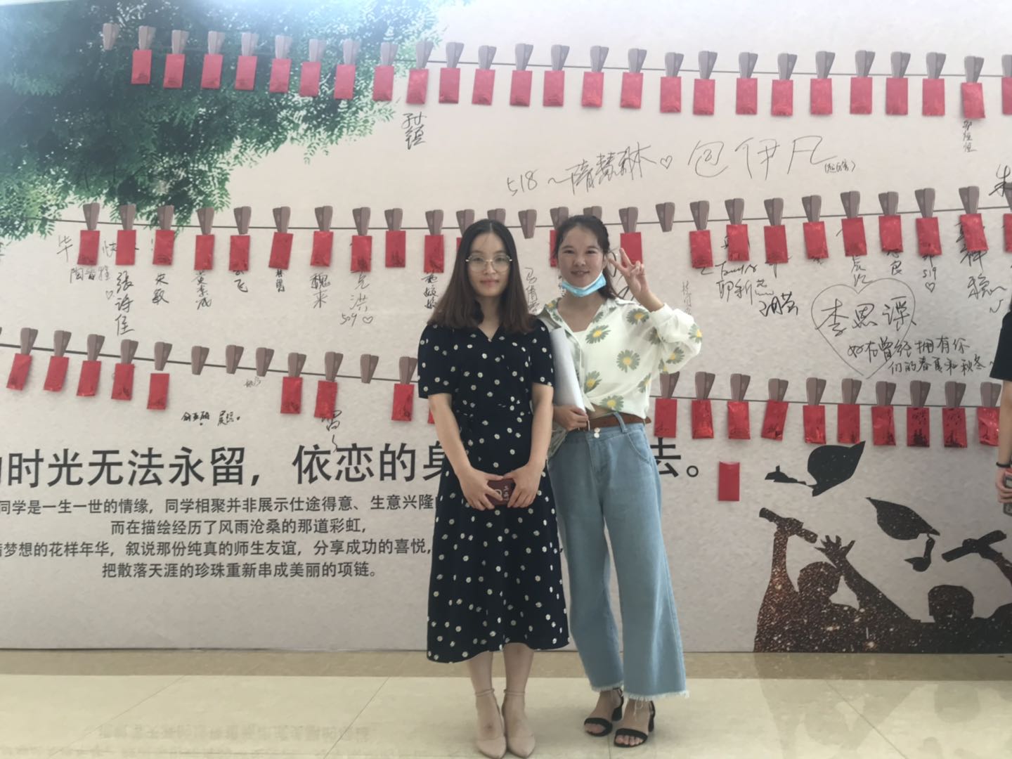 学生在红包墙前合影留念