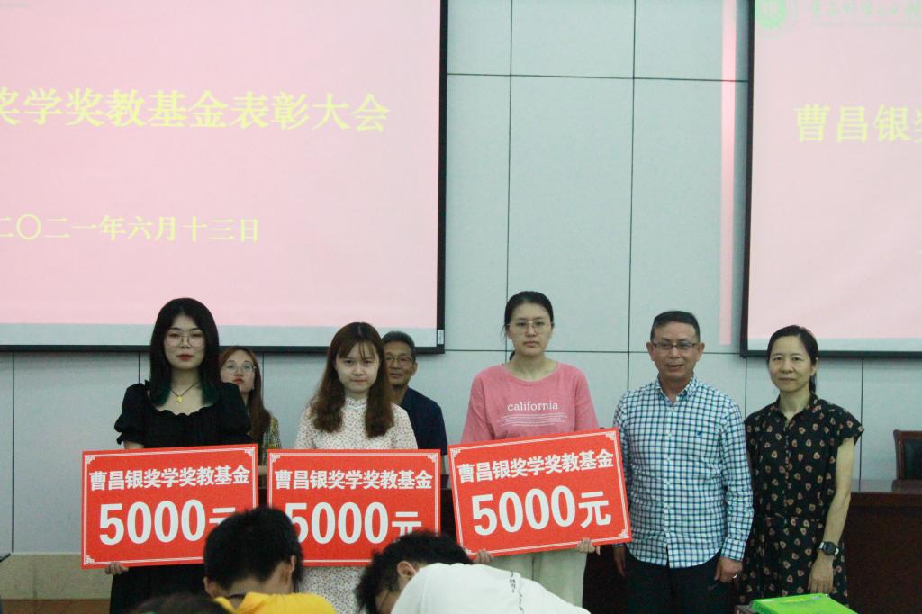 之后,在工科楼阶梯教室举办了曹昌银奖学奖教基金表彰大会,表彰一志愿填报并录取为本院研究生的学院应届毕业生。许文彪书记首先宣读了曹昌银奖学奖教基金关于应届毕业生考取本院硕士研究生奖励办法,每人奖励5000元。曹昌银董事长和冯建红女士为获奖的毕业生进行了颁奖。最后,曹昌银董事长表达了对母校的感激和身为南财人的自豪之情,讲述了创业过程的艰辛与努力,他希望学弟学妹不仅要勤奋、踏实学好专业知识,还要多参加社会实践,提高自身修养,不断完善自己,早日成为国家和社会的栋梁之才!