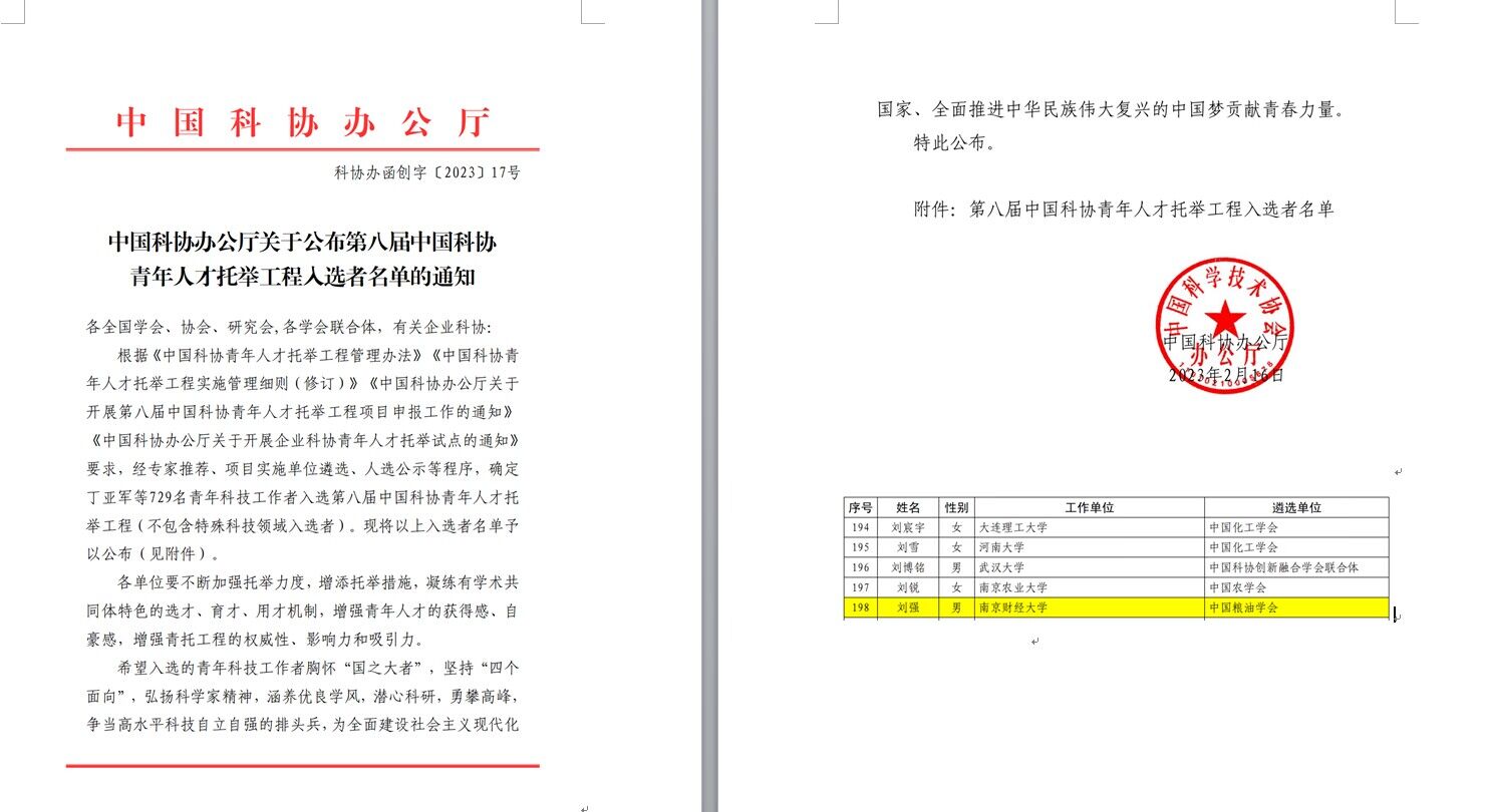 刘强博士在粮油及其食品储藏领域取得了创新性研究贡献,经专家推荐、项目实施单位遴选、人选公示等程序,成功入选中国科协青年人才托举工程,这是我校青年教师首次获此殊荣。
