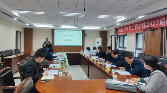 在食品科学与工程楼211会议室举行2023年应用化学专业校内预评估会议,预评估专家组组长、应用数学学院教授王宏勇,原教务处处长张进,校教学督导、经济学院教授郭存芝,校教学督导、会计学院教授胡晓明,教务处副处长赵昂等预评估专家组成员、学院分管教学副院长沈飞教授以及应用化学专业相关教师参加会议。会议由评估及质量监控中心何玉副主任主持。
