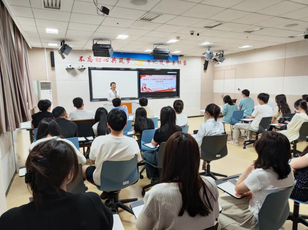 李煜副校长从“是什么、为什么、怎么样”三个维度带领与会学生学习《中国共产党纪律处分条例》。她指出,纪律是党的生命线、是党员的高压线,开展党纪学习教育,是党推进自我革命、跳出历史周期率的重要举措。《中国共产党纪律处分条例》是规范党员行为的基础性法规,其颁布实施对于维护党的章程,纯洁党的组织,贯彻党要管党、从严治党的方针起着非常重要的作。她指出,作为一名大学生必须要学法懂法,将党纪国法内化于心、外化于行,严守底线,不越雷池一步。同时,她勉励在座同学要择一事忠一事,坚守自己的岗位和职责,为党和人民的事业贡献自己的力量。
