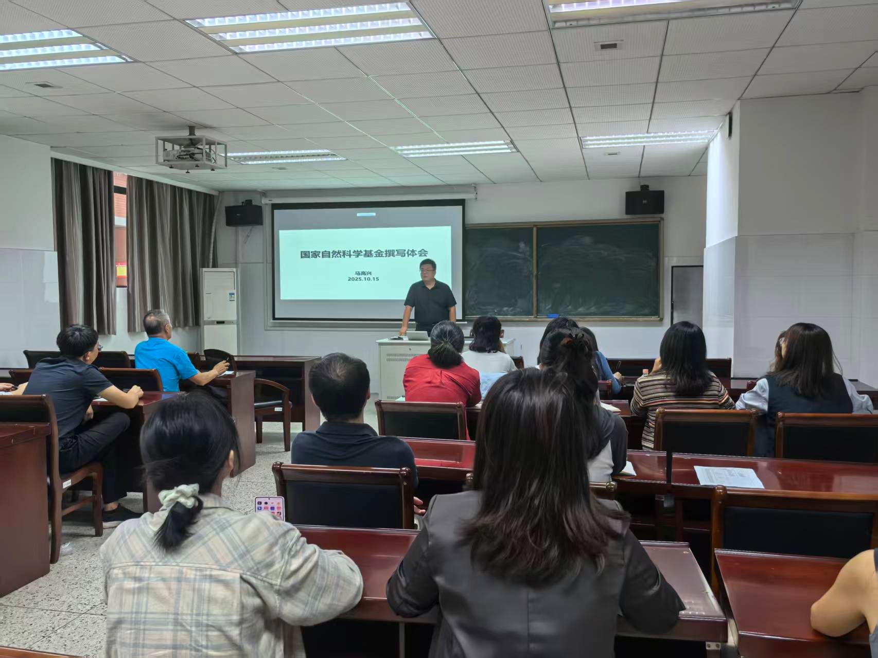 的马高兴老师和熊文飞老师分别围绕“国家自然科学基金撰写体会”和“基于蛋白质-多糖间相互作用设计高蛋白质构改良食品的探索”作了学术报告。本次活动由沈新春教授主持,学院青年教师及部分研究生到场聆听。