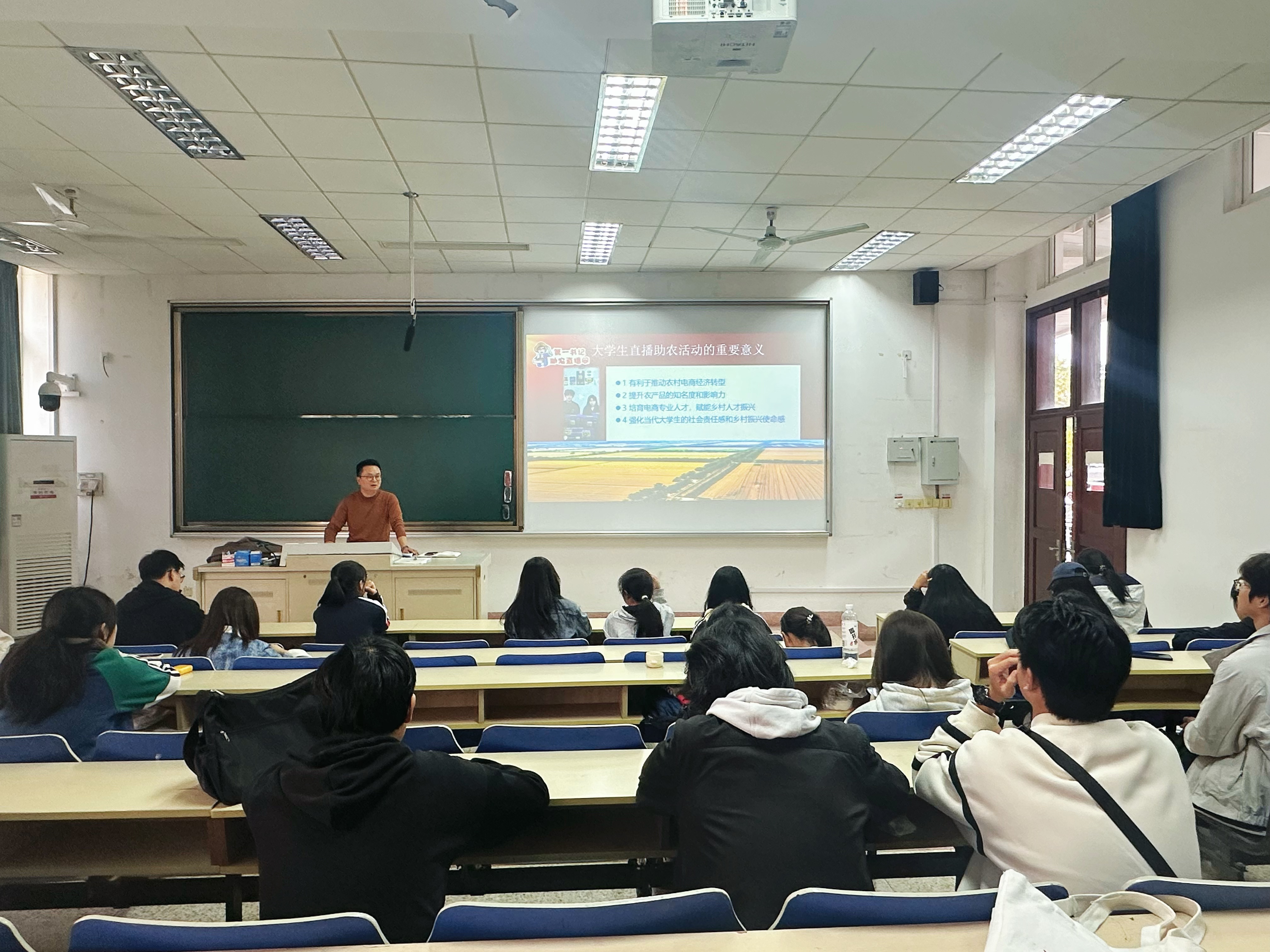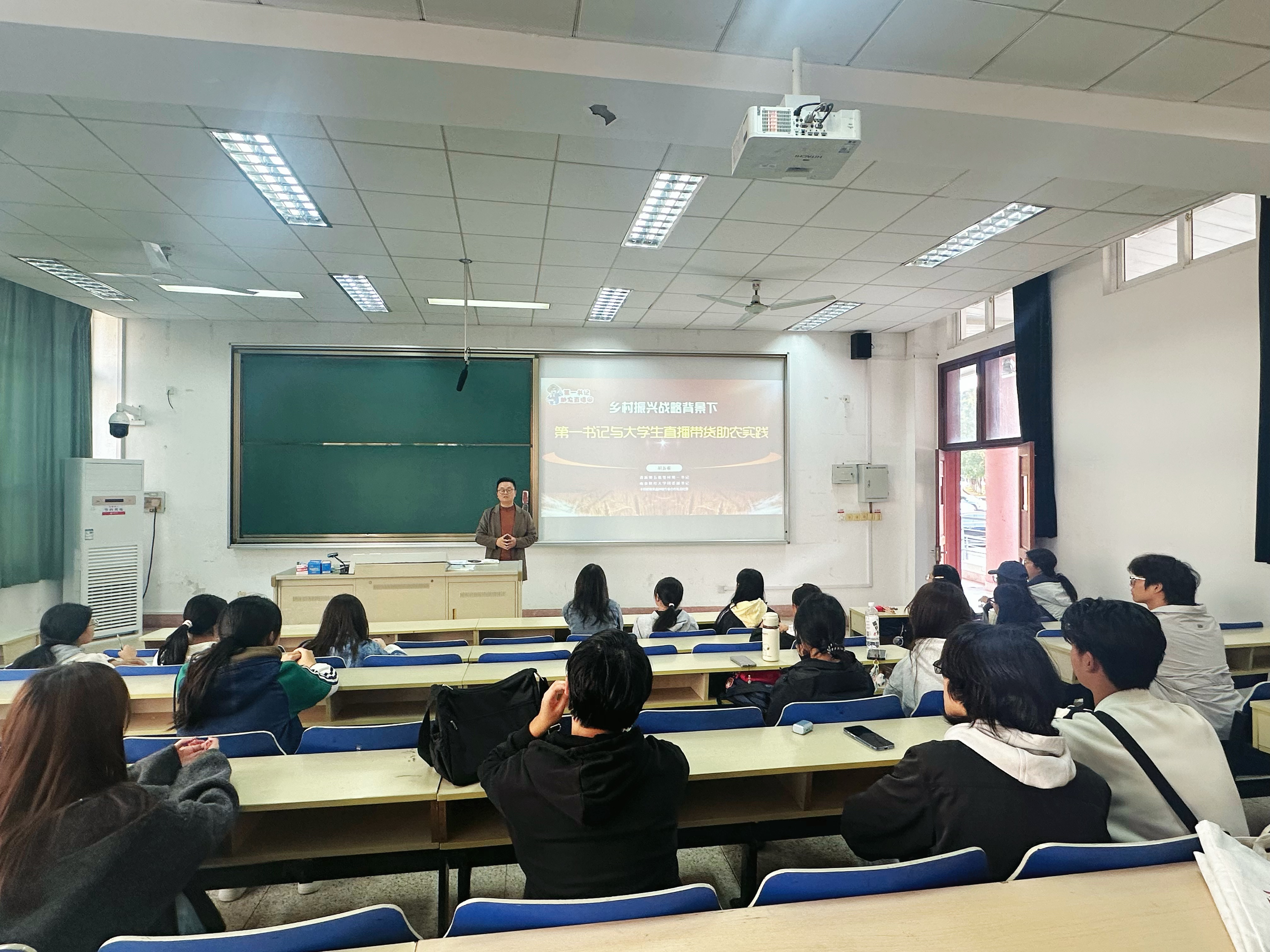 讲座中,胡新蕲书记以“乡村振兴战略背景下第一书记与大学生直播带货助农实践”为主题,分享了从“胡老师”到“胡主播”的转型经历。“直播带货不是让产品上架,是逼自己‘上架’。”他结合自身自学“苏货新农人”课程、考取直播结业证书的成长历程,详解了品牌打造、直播间互动、平台规则等实战技巧,还通过“人生百味萝卜开胃”等特色直播案例,拆解了从产品深加工到全链条品控的运营逻辑。针对新农干班学员的需求,他特别强调:“新农干班同学们直播要带着青年人的专业素养,要凭借知识储备吃透产品特性,以青春视角讲好品牌故事,更要讲好农耕故事。”