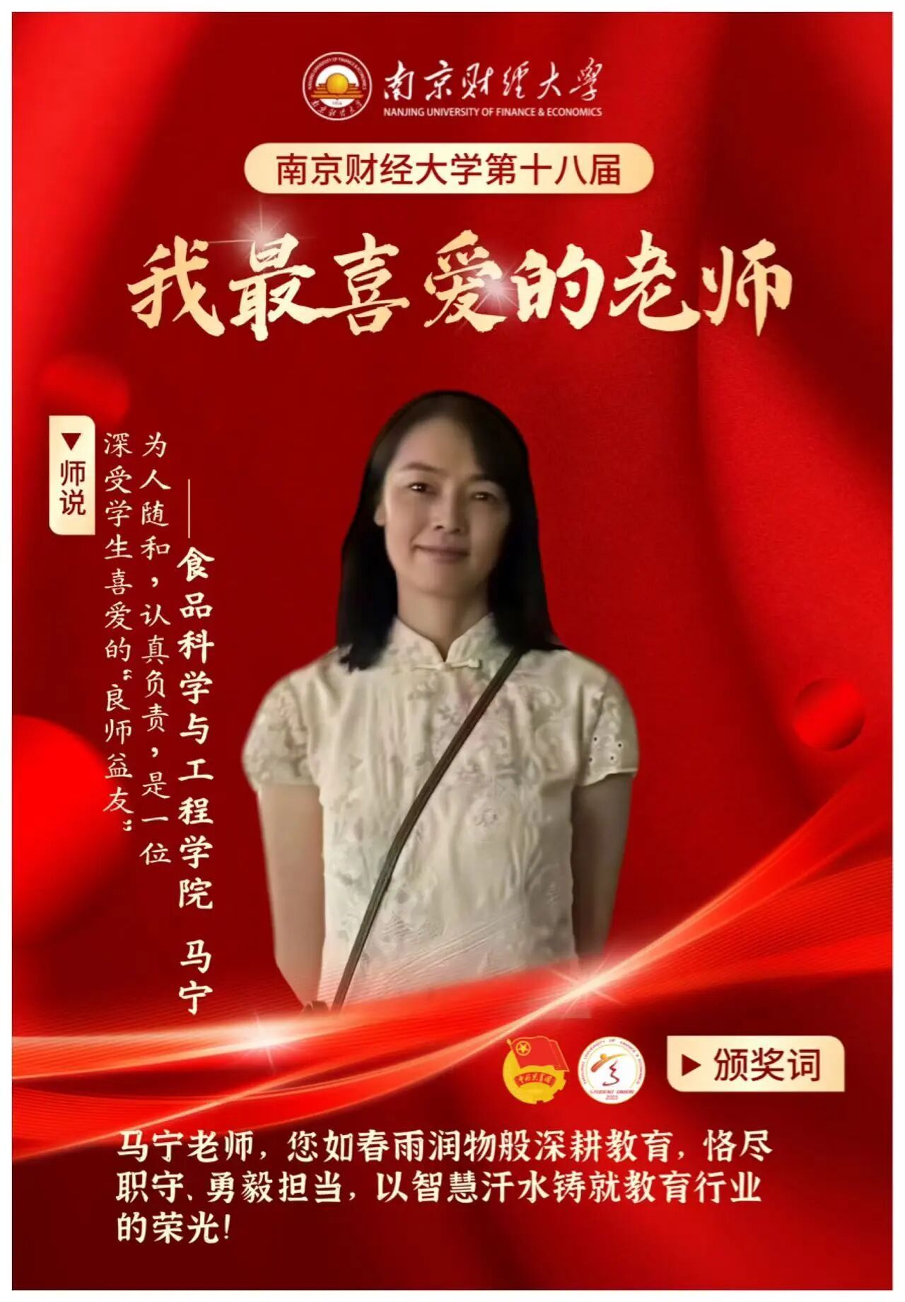 第十八届“我最喜爱的老师”评选活动的通知》要求,历经班级海选提名、学院学生会汇总投票、多部门联合审查等环节。马宁老师作为专任教师代表,其当选展现了其在学生中的高认可度和影响力。 马宁老师长期致力于教学改革与科研创新,主持国家自然科学基金等多项课题,在Journal of Agricultural and Food Chemistry等高水平期刊发表论文20余篇,并荣获授权国家发明专利。在学生眼中,她既是严谨的学术引路人,也是关爱学生成长的良师益友,其课堂生动有趣、深入浅出,课后常与学生交流学术动态与生涯规划,深受历届学生好评。