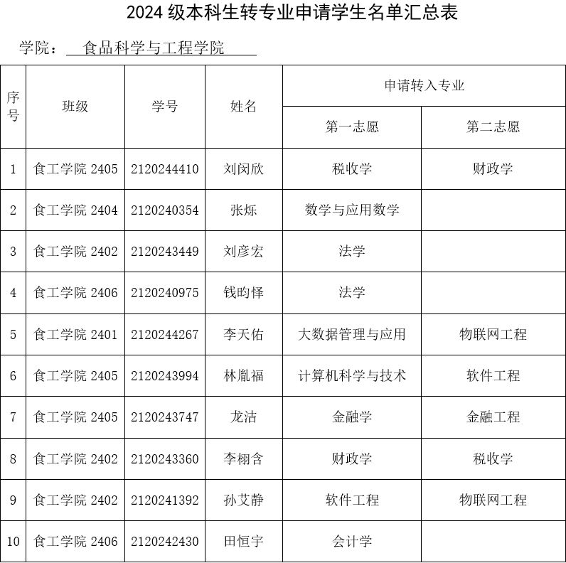 根据《av女优 本科生转专业管理办法》(南财大校字〔2024〕15号)、《关于2024-2025学年第二学期本科生转专业工作安排的通知》(南财教字〔2025〕18号)要求,经学生个人申请、学院转专业领导小组审核,现将2024级本科生申请转专业学生名单予以公示。