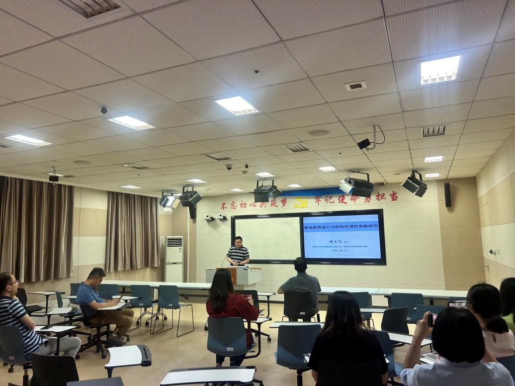 在食工楼214室举办2023年第六期“学术沙龙”活动。刘建辉老师和熊文飞老师分别作了题为“茶多酚调节小肠绒毛长度和脂肪酸代谢的研究”和“粮油植物蛋白功能特性调控策略研究”的学术报告。学院院长助理陆颖健教授和部分师生参加了本次活动。学术沙龙由汤晓智教授主持。