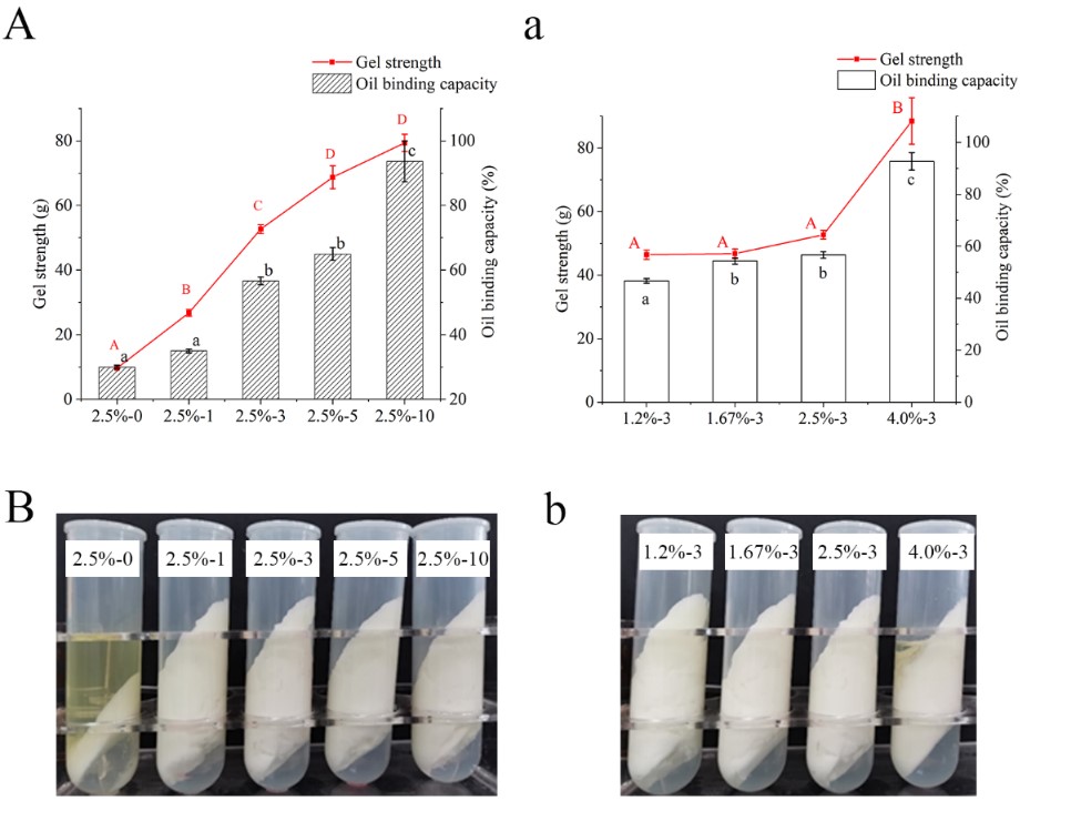 图6不同浓度的肉桂精油和CGCC浓度稳定的HIPE冻融后的凝胶强度和油结合能力 (A, a),离心后的外观(B,b)。