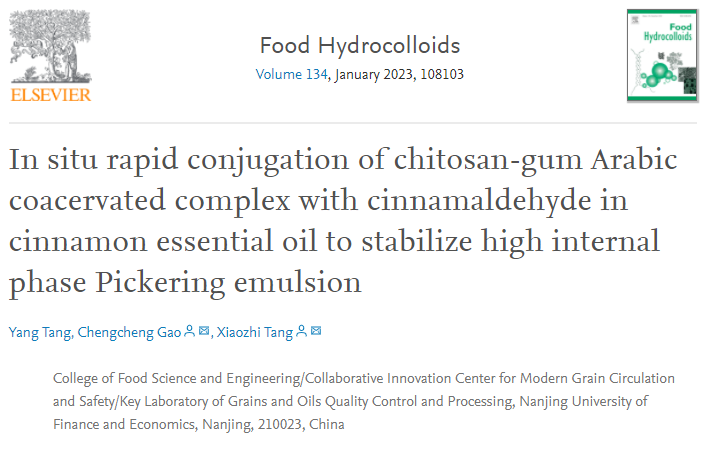 汤晓智、高成成(通讯作者)在国际TOP期刊Food Hydrocolloids(Q1,IF: 11.504)发表题为“In situ rapid conjugation of chitosan-gum Arabic coacervated complex with cinnamaldehyde in cinnamon essential oil to stabilize high internal phase Pickering emulsion”的研究性论文。