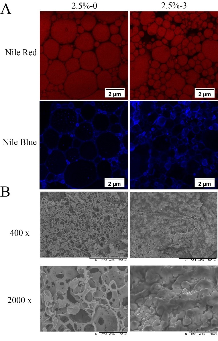 图3 2.5%-0和2.5%-3样品的CLSM图像(A)和SEM图像(B)。