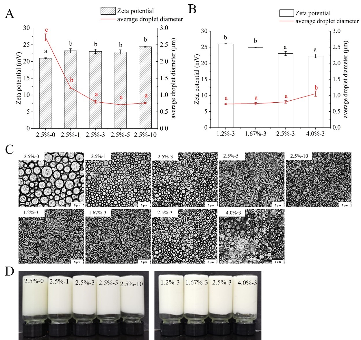 图2 不同浓度的精油和CGCC稳定的HIPEs的Zeta电位和平均液滴直径(A, B)。HIPEs的光学显微图(C)和外观图(D)。