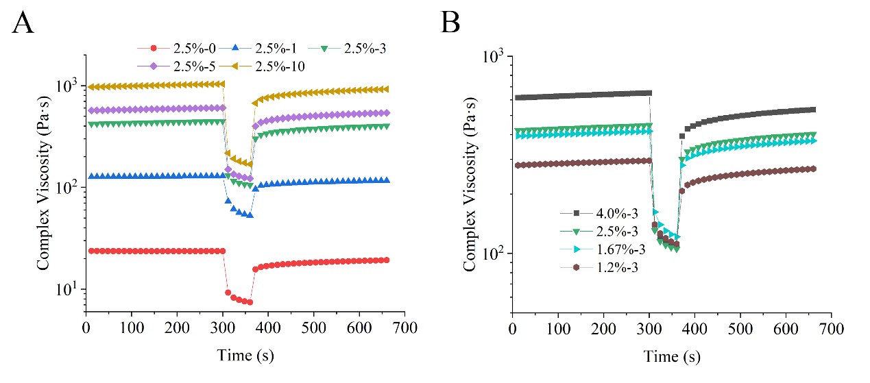 图5 不同浓度的肉桂精油(A)和CGCC 浓度(B)稳定的HIPEs的触变恢复性。