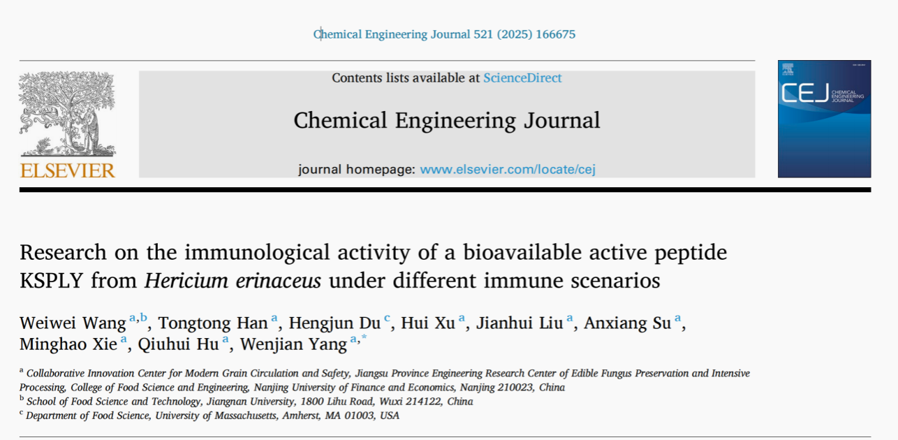 杨文建教授团队在国际顶级期刊《Chemical Engineering Journal》(Q1,中科院1区Top,IF=13.2)发表题为“Research on the immunological activity of a bioavailable active peptide KSPLY from Hericium erinaceus under different immune scenarios”的研究性论文。av女优