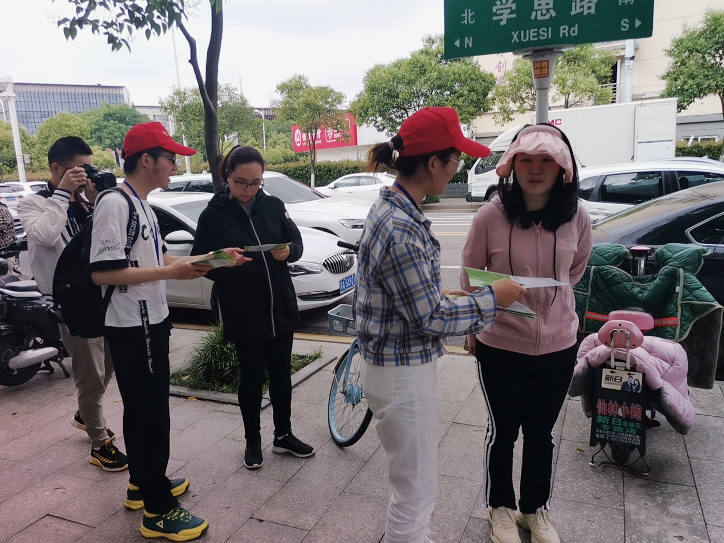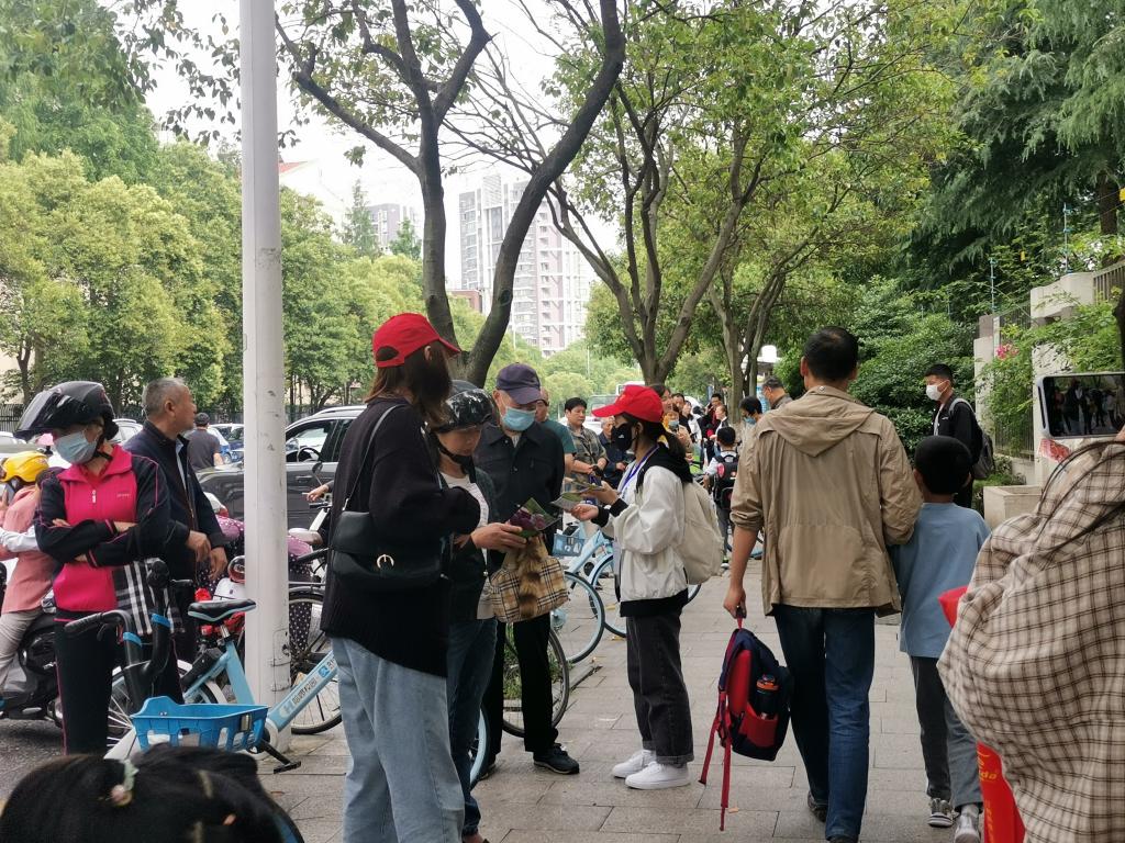 分团委组织志愿者在中小学校外向学生家长们发放自编的食品营养手册,向家长们介绍食品营养知识。