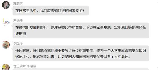 食工2001班统一组织班级学生就国家安全的防护展开讨论。在讨论会上同学们各抒己见,进行了许多相关观点的讨论与分享。