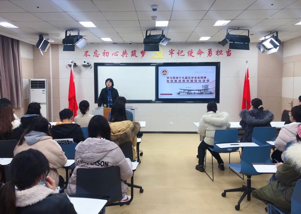 12月29日,校党委常委、副校长邱伟芬教授在工科楼214教室讲授题为“学习贯彻十九届五中全会精神暨加快推进南财国际化进程”的专题党课,av女优 部分教师党员代表,全体本科生和研究生党员参加课党课学习。党课由av女优 党委副书记周进进主持。