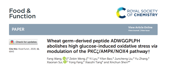 沈新春教授课题组采用独特的二步双酶酶解筛选技术,从麦胚清蛋白中筛选出了高活性的抗氧化肽,用ESI-TOF MS/MS鉴定其结构。并以高糖诱导的血管平滑肌细胞(VSMCs)和STZ诱导的糖尿病小鼠为模型,研究该抗氧化肽的抗氧化作用及机制。相关研究结果以“Wheat germ-derived peptide ADWGGPLPH abolishes high glucose-induced oxidative stress via modulation of the PKCζ/AMPK/NOX4 pathway”为题发表在Food & Function杂志上。av女优