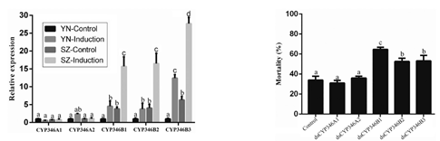 赤拟谷盗(Tribolium castaneum)是一种危害极大的鞘翅目储粮害虫,在世界各地均有分布,每年给储藏物造成数十亿美元的经济损失。储粮害虫绿色防控团队经过多年的采样和大量的监测数据,对我国多个赤拟谷盗地理种群的磷化氢抗性情况进行了报道,在此基础上,通过P450酶系的增效剂和药剂胁迫实验,证实P450介导的解毒代谢抗性是导致赤拟谷盗磷化氢抗性产生的重要因素。随后,研究团队利用基因定量检测和RNA沉默(RNAi)技术成功在P450基因超家族中鉴定出CYP345B亚家族三个关键性基因元件,证实该亚家族基因在赤拟谷盗抗性种群中的过量表达导致了磷化氢抗性产生。以上发现揭示了我国赤拟谷盗磷化氢抗性发生规律,阐明了P450参与的外源化合物解毒代谢在磷化氢抗性形成机制中的分子基础,为磷化氢抗性治理和储粮害虫防控新方法的开发提供了重要的理论依据和应用数据。