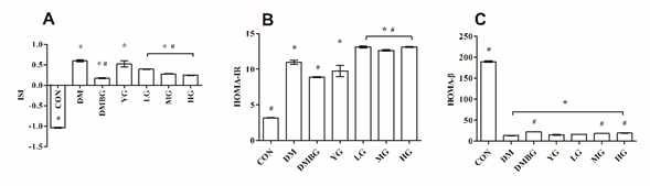 图1 不同剂量GABA酸奶对胰岛素敏感性指标的影响 (A)胰岛素敏感性指标(ISI);(B)胰岛素抵抗指数(HOMA-IR);(C)胰岛β细胞功能指数(HOMA-β)
