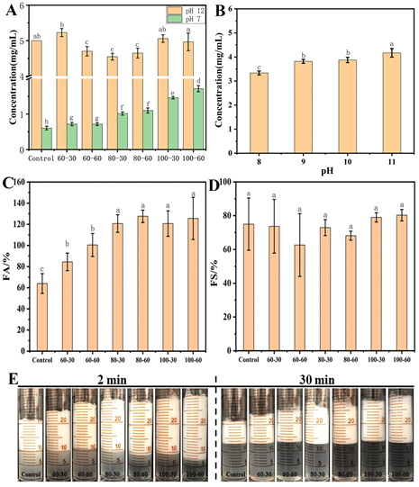 图1. 不同热处理对大米谷蛋白在不同pH溶解能力(A、B)、起泡能力(C)、泡沫稳定性(D)和泡沫表观形态(E)的影响;热处理前,蛋白质溶于pH12水溶液(5 mg/mL);图中60-30/60、80-30/60、100-30/60分别表示在60、80、100 ℃处理30和60 min。