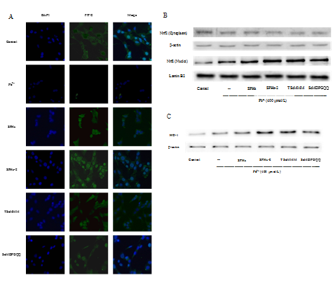 (A)激光共聚焦分析Nrf2易位;(B), (C)Western blotting分析Nrf2和Ho-1蛋白的表达情况