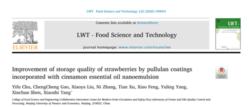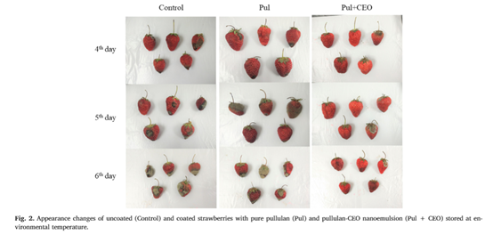 草莓果实营养丰富,拥有“水果皇后”的称号。然而,草莓成熟后表皮极薄,在采摘和储存过程中极易受到机械损伤与细菌霉菌侵染,通常情况下在常温放置3天即失水霉烂严重,失去商业价值。因此,如何维持新鲜草莓的品质,延长草莓的储藏时间一直以来都是国内外研究人员的热点问题。涂膜保鲜法因为具有操作简单易行、良好的气体选择透过性和有效防止微生物侵入等优势,成为近年来果蔬采后保鲜领域的热点研究方向。本研究以天然高分子可降解材料普鲁兰多糖为成膜基材,添加肉桂精油纳米乳液以提升复合膜的抗菌性能。对新鲜草莓涂抹保鲜的应用研究发现, 经过肉桂精油纳米乳液/普鲁兰多糖基复合膜液涂膜后的草莓,其在贮藏期结束时的重量损失、腐败率、硬度、可溶性固形物、可滴定酸和微生物指标均显著好于纯普鲁兰膜液组和对照组的草莓。实验结果表明草莓果实经过肉桂精油纳米乳液/普鲁兰多糖基复合膜液涂膜处理后,可以有效地延长贮存期,延缓衰老,并保持良好的外观品质,可见使用肉桂精油纳米乳液/普鲁兰多糖基复合膜液涂膜是一种极具潜力的保鲜手段。相关研究结果以“Improvement of storage quality of strawberries by pullulan coatings incorporated with cinnamon essential oil nanoemulsion”为题发表在LWT杂志上,av女优