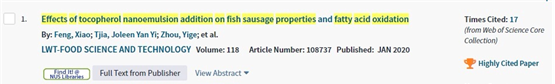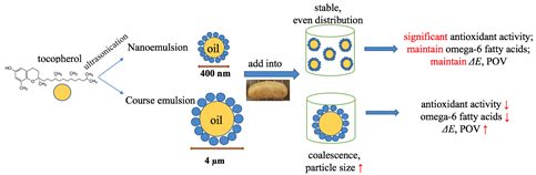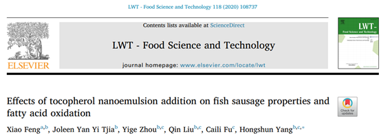 包埋维生素E的纳米乳液在鱼肠中的添加可以有效延缓鱼肉肠内油脂的氧化,并且对其中的不饱和脂肪酸起到保护作用。相比较而言,微米级的维E乳液添加对于鱼肠的脂肪氧化并没有显著的抑制作用。纳米乳液具有粒径小、分布均匀且较稳定的性质,促使维生素E发挥了显著的抗氧化作用。与此同时,研究发现纳米乳液的添加并不影响鱼肠的质构及色泽,可以广泛应用于食品工业生产中。相关研究结果以“Effects of tocopherol nanoemulson addition on fish sausage properties and fatty acid oxidation”为题发表在LWT杂志上,并入选农业科学领域ESI高被引论文。av女优