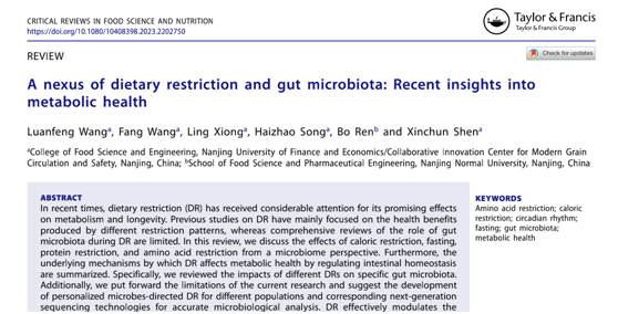沈新春教授团队与南京师范大学食品与制药工程学院青年教师在国际食品领域顶级期刊《Critical Reviews in Food Science and Nutrition》(中科院1区TOP期刊,IF=11.208)上发表题为“A nexus of dietary restriction and gut microbiota:Recent insights into metabolic health”的综述论文,全面阐述了基于代谢健康调控的不同饮食限制模式与肠道菌群之间的关系。