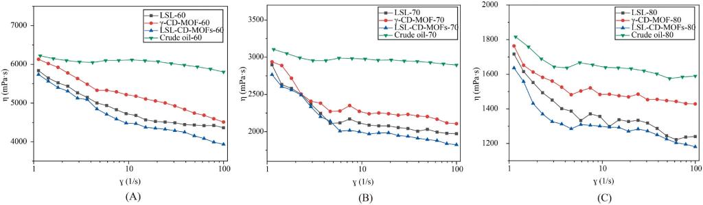 图5 LSL-CD MOFs的降粘效率(A-60℃, B-70℃, C-80℃)
