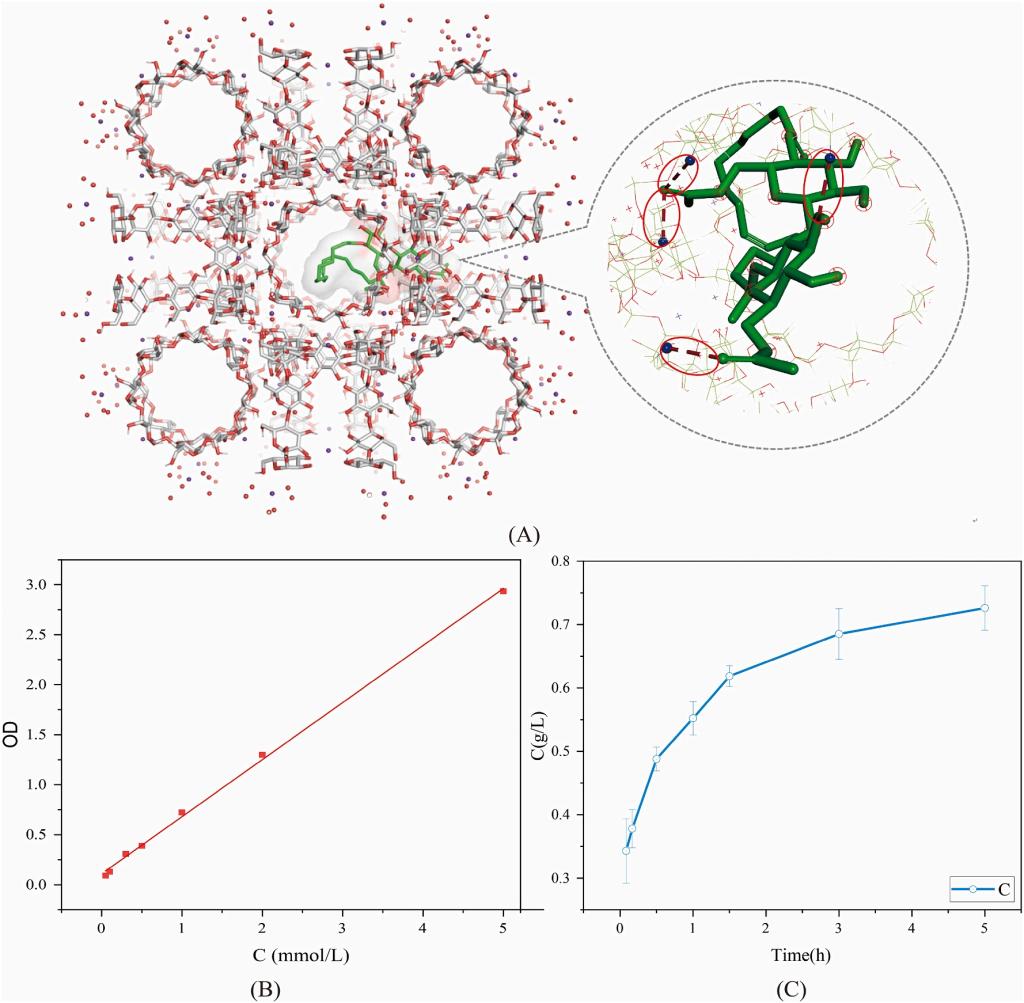 开发了内酯型槐糖脂的新型载体γ-CD-MOFs,使槐糖脂溶解度提高了10.9倍,所制备的复合物LSL-CD-MOFs的油洗效率为85.82%±2.04%。可用于增强油田三次采油效率。
