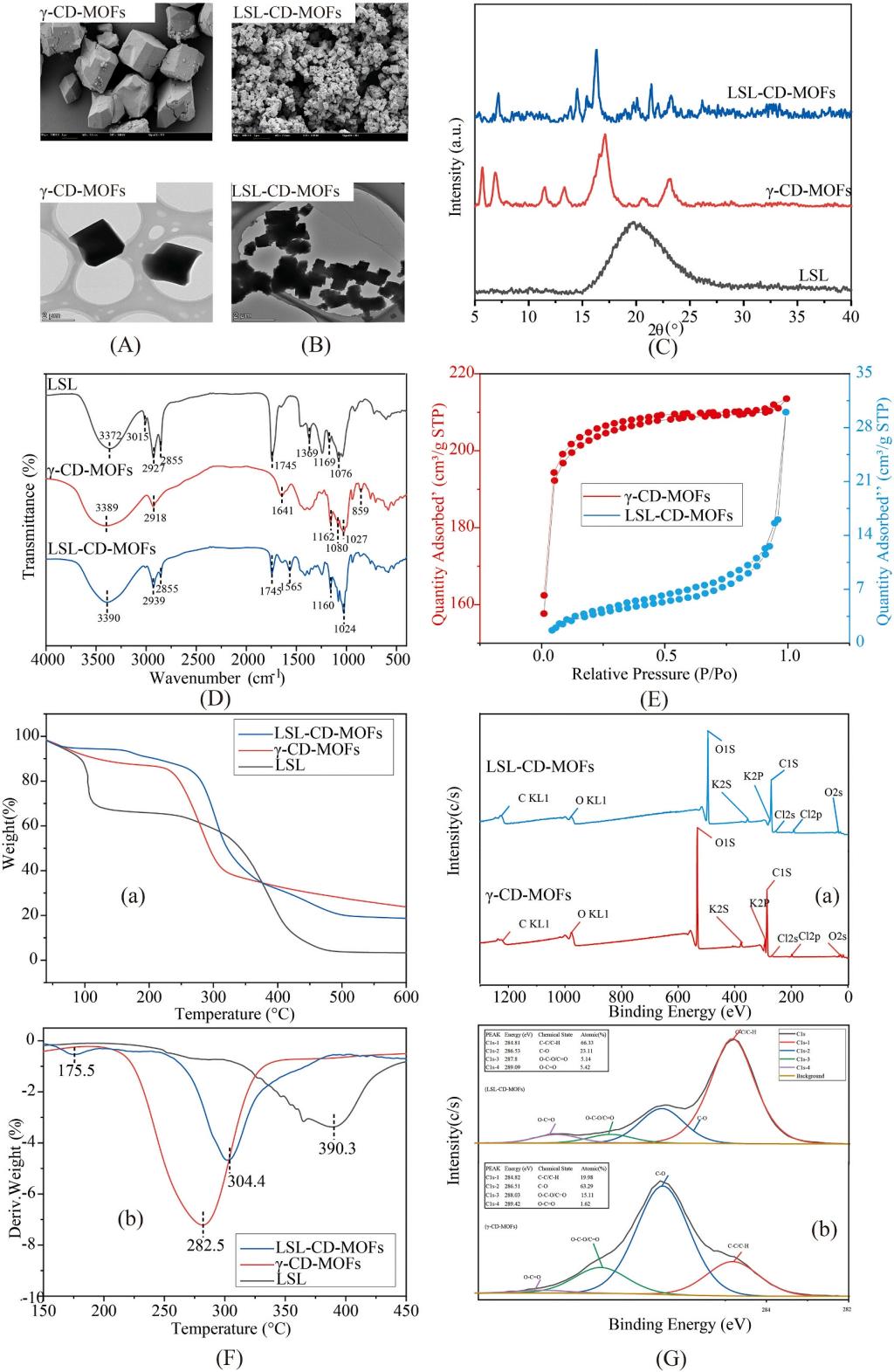 图2 γ-CD-MOFs和LSL-CD-MOFs的表征(A-SEM,B-TEM, C-XRD,D-FTIR,E-N2等温吸附线,F-TGA和DTG,G-XPS)