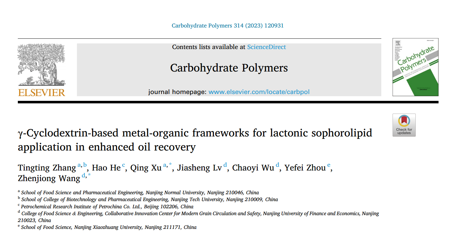 汪振炯副教授(通讯作者)在国际TOP期刊Carbohydrate Polymers(Q1,IF: 11.2)发表题为“γ-Cyclodextrin-based metal-organic frameworks for lactonic sophorolipid application in enhanced oil recovery”的研究性论文。