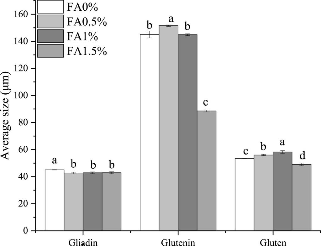 图3不同FA添加量麦醇溶蛋白(A)、麦谷蛋白(B)以及面筋蛋白(C)的粒径