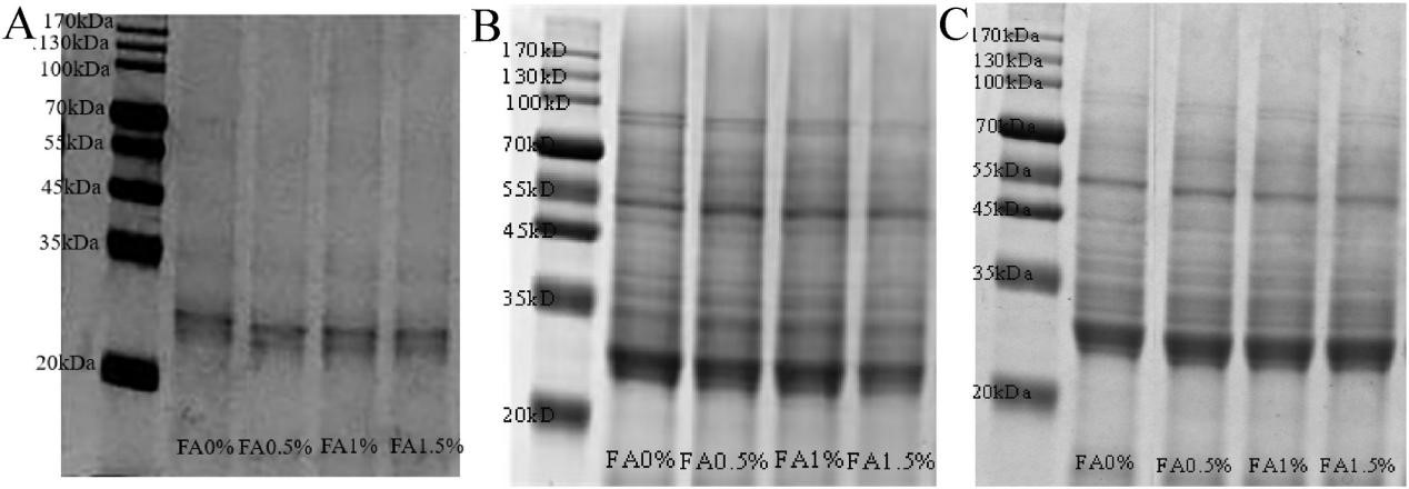 图2 不同FA添加量麦醇溶蛋白(A)、麦谷蛋白(B)和面筋蛋白(C)SDS-PAGE图