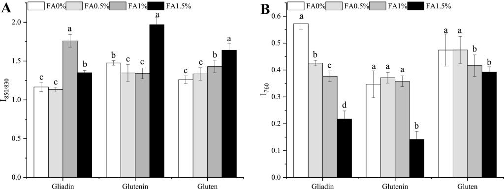 图6 不同FA添加量面筋蛋白组分酪氨酸双峰I850/830(A)和色氨酸残基I760(B)的变化