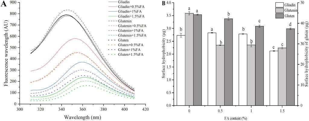 全谷物食品富含矿物质、维生素和酚酸等营养成分,可改善人体健康,因此人们对全谷物食品的需求不断增加。作为全谷物食品的重要组成部分,全麦产品的需求量很大。然而,由于小麦麸皮的不良质地和感官特性,全麦产品受到限制。前期研究表明,阿魏酸(FA)可以与酪氨酸共价交联从而影响面团性能,在面筋蛋白聚集过程中发挥关键作用。同时,FA通过与半胱氨酸相互作用影响面筋蛋白聚集以及面筋网络结构的形成,避免面筋网络结构形成过程中的氧化交联,减少麸皮中水不可提取固体对面团的不利影响。然而,由于麦醇溶蛋白、麦谷蛋白面筋蛋白关键组分与FA之间的相互作用尚不明确,缺乏关于FA对面筋蛋白及其组分聚集特性的影响机制研究。