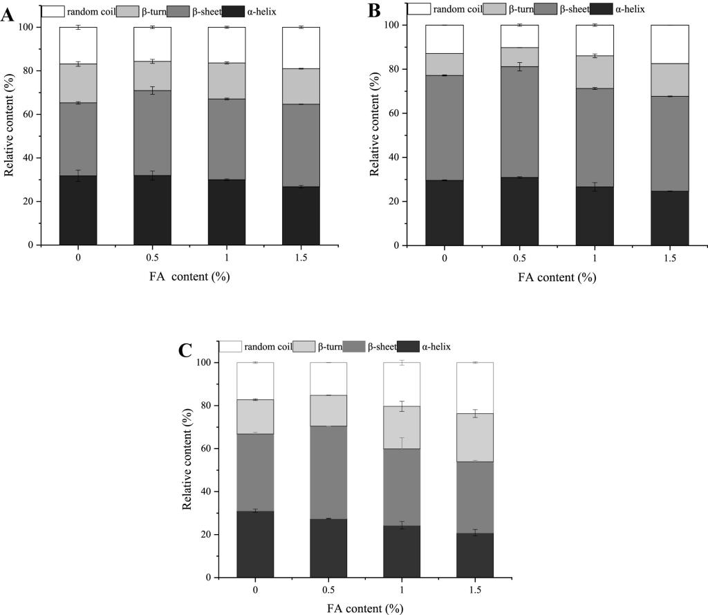 图5 麦醇溶蛋白(A)、麦谷蛋白(B)和面筋蛋白(C)样品二级结构的相对含量