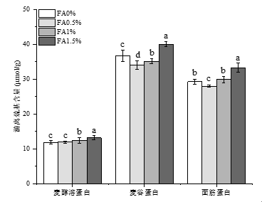 图1 不同FA添加量麦醇溶蛋白、麦谷蛋白和面筋蛋白的游离巯基含量变化