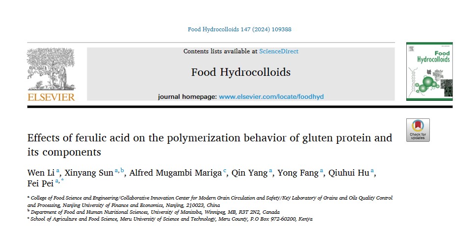 李文(第一作者)、裴斐(通讯作者)在国际TOP期刊Food Hydrocolloids(Q1,IF: 10.7)发表题为“Effects of ferulic acid on the polymerization behavior of gluten protein and its components”的研究性论文。