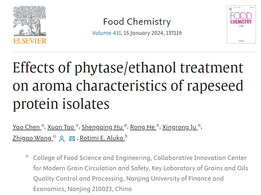 王志高副教授(通讯作者)在国际TOP期刊Food Chemistry(Q1,IF: 8.8)发表题为“Effects of phytase/ethanol treatment on aroma characteristics of rapeseed protein isolates”的研究性论文。av女优