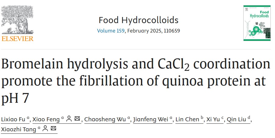 汤晓智教授、冯潇副教授在国际食品TOP期刊Food Hydrocolloids (Q1, IF=11.0)发表题目为“Bromelain hydrolysis and CaCl2 coordination promote the fibrillation of quinoa protein at pH 7”的研究性论文。