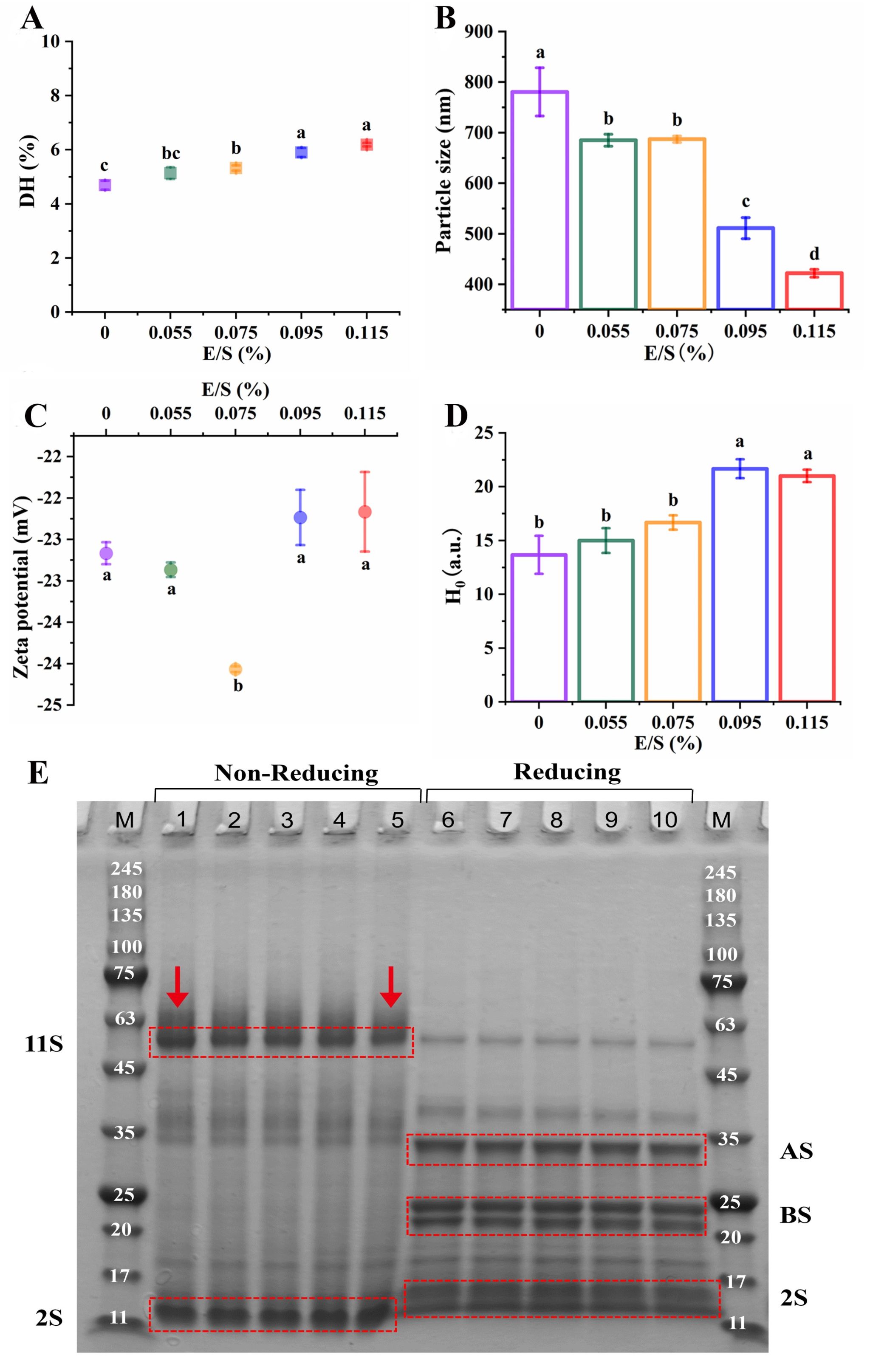 Fig. 2. Effects of E/S on the physicochemical properties of QPI. (A) DH, (B) Particle size, (C) Zeta potential, (D) Surface hydrophobicity (H0), (E) Protein composition.