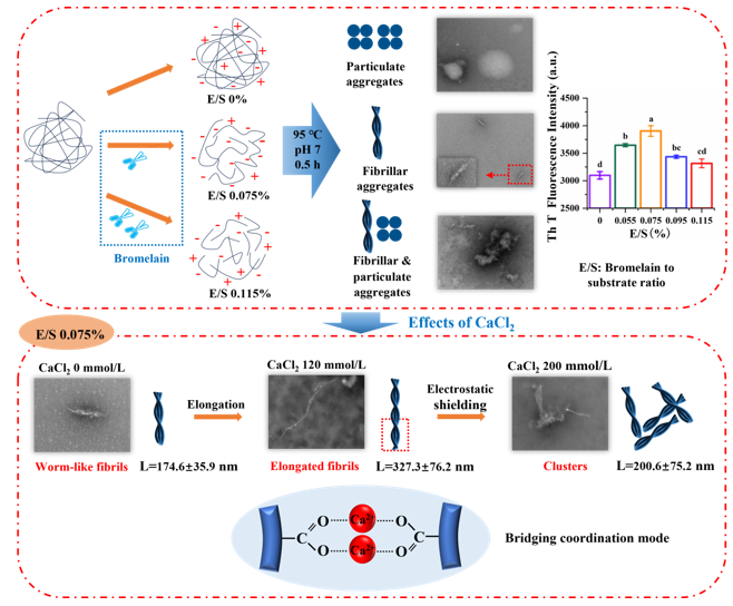 藜麦蛋白具有较高的营养价值,含有所有必需氨基酸,但是较弱的凝胶性限制了其加工和应用。在pH 2条件下形成的植物蛋白的纤维聚集体可以改善凝胶性,但是蛋白纤维会随着pH的变化而分解。我们发现中性条件下蛋白酶水解藜麦分离蛋白可以代替酸水解、并在热诱导后形成纤维聚集体。当酶底比(E/S)增大到0.075%时,蛋白间静电斥力增加,但是疏水相互作用无显著性变化,这两种分子间驱动力的协同作用有利于纤维聚集体的形成。然而,E/S的持续增加导致纤维聚集体减少,这是因为静电斥力降低、疏水相互作用增加加快了聚集速率。当E/S为0.075%时,随着CaCl2浓度从0增加到120 mmol/L,平行β-折叠含量增加,纤维聚集体长度从175 nm增加到327 nm。Ca2+与羧基之间为桥接配位模式。然而,当CaCl2浓度增加到160和200 mmol/L时,由于静电屏蔽作用,纤维聚集体团聚并变短,导致凝胶性降低。我们提出了一种在中性条件下制备QPI纤维聚集体的创新方法,揭示限制性菠萝蛋白酶水解及适当浓度的CaCl2配位可以通过调节蛋白纤维化程度而改善藜麦蛋白的凝胶性。