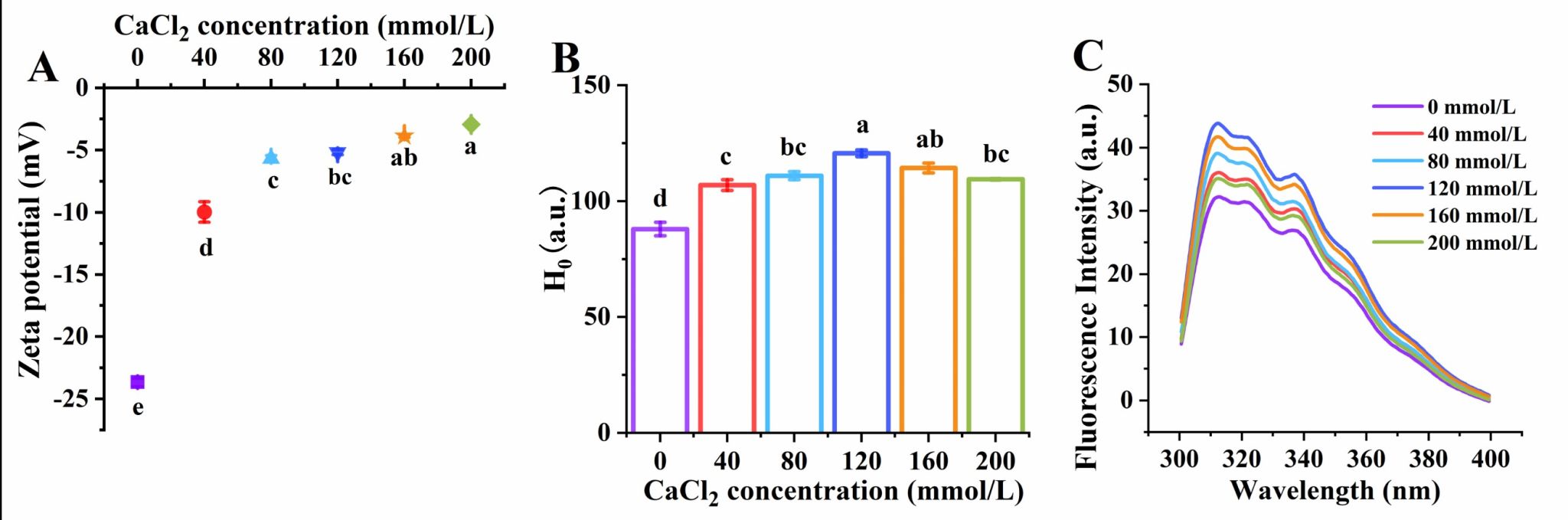 Fig. 3. Effects of CaCl2 concentration on the zeta potential (A), surface hydrophobicity (B) and intrinsic fluorescence intensity (C) of QPI aggregates.