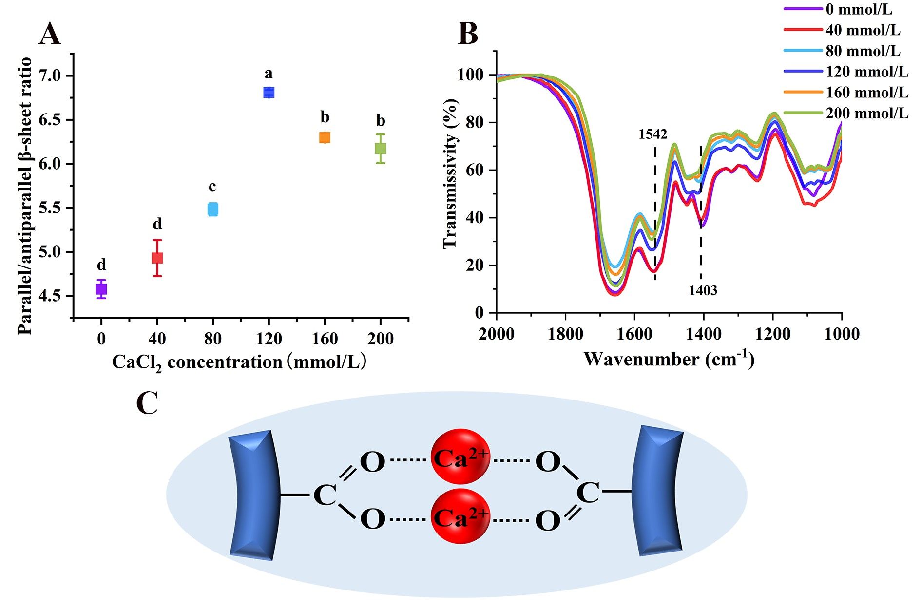 Fig. 5. (A) Effects of CaCl2 concentration on the parallel/anti-parallel β-sheet ratio of QPI aggregates. (B) The FTIR spectrum of QPI aggregates at different CaCl2 concentrations. (C) Bridging coordination mode between carboxyl groups and Ca2+