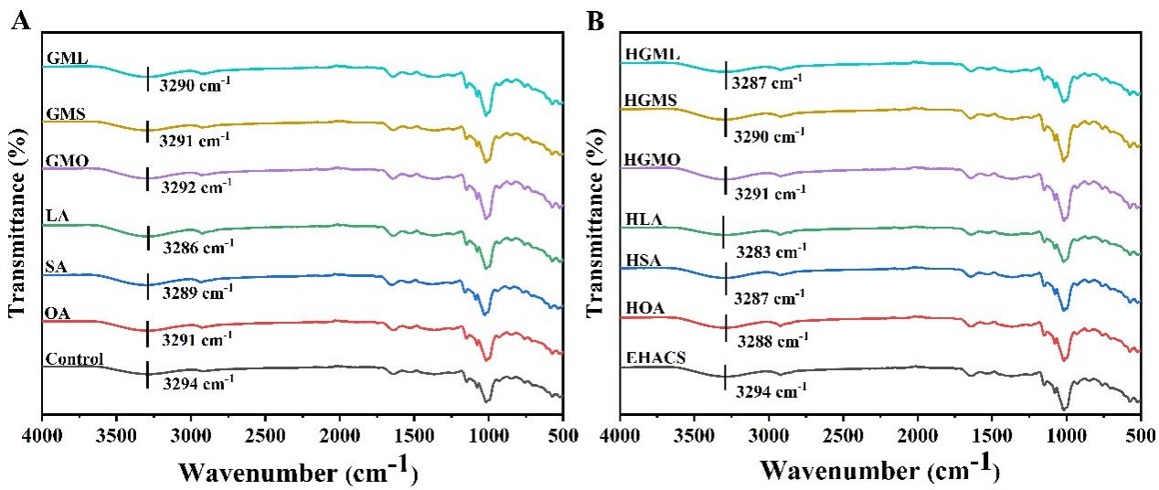 Fig. 2. FTIR spectroscopy of extruded buckwheat noodles without high-amylose corn starch (A) and with high-amylose corn starch (B).