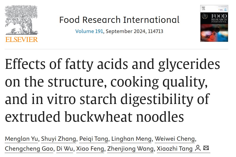 汤晓智教授团队在国际食品TOP期刊Food Research International (Q1, IF=7.0)发表题目为“Effects of fatty acids and glycerides on the structure, cooking quality, and in vitro starch digestibility of extruded buckwheat noodles”的研究性论文。