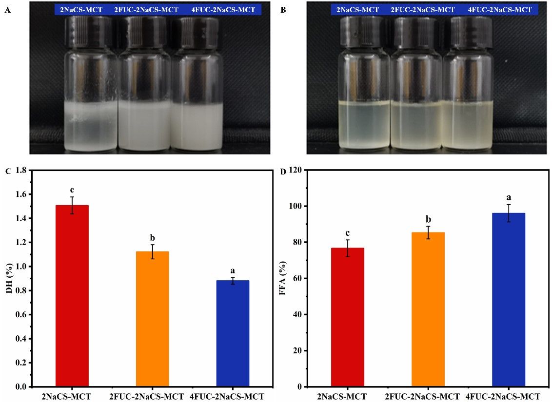本研究通过调节岩藻多糖(FUC)和酪蛋白酸钠(NaCS)之间的静电相互作用来提高乳液稳定性。随着 FUC 浓度的增加,复合物从可溶状态转变为相分离,然后恢复到均相状态,浊度和粒径最初增加,然后减小。TEM 和SEM微观结构表明,NaCS颗粒通过静电相互作用与FUC交联链网络键合,形成自组装复合物。随后,模拟消化结果表明,FUC-NaCS复合物可以延缓NaCS的水解,并在胃环境中表现出更好的稳定性。基于上述结果,利用FUC-NaCS复合物乳化和稳定中链甘油三酯(MCT)。FUC-NaCS乳液在4:2时的液滴分散性更强,直径更小,在胃消化过程中也表现出优异的稳定性,同时在肠道消化过程中也表现出较高的消化率,使 FUC-NaCS 复合物成为在胃肠道环境中 pH 触发乳液释放的潜在选择。