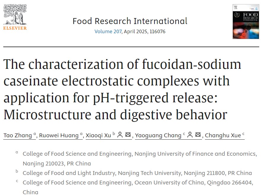 常耀光教授等联合在国际TOP期刊Food Research International(Q1,IF: 7.0)发表题为“The characterization of fucoidan‑sodium caseinate electrostatic complexes with application for pH-triggered release: Microstructure and digestive behavior”的研究性论文。