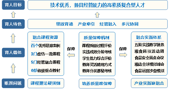 av女优 和浙江工商大学地处长三角经济发达地区江苏省、浙江省两个经济大省,在新常态下国家经济社会发展背景下,两校重点围绕食品科学与工程、食品质量与安全、粮食工程等食品类核心专业,探索了适应经济和时代发展的食品科学与工程类人才培养模式,形成了较为完善的融合人才培养的理论体系,共同凝练“技术优秀,兼具经管能力的高素质复合型人才”的培养理念,发挥学科交叉和产教融合优势,对理论课程、实践教学和协同机制进行多元化改革,破解技术与管理、理论与实践割裂的问题,构建了“产业牵引、经管融入、多元协同”的融合育人模式(图2)。